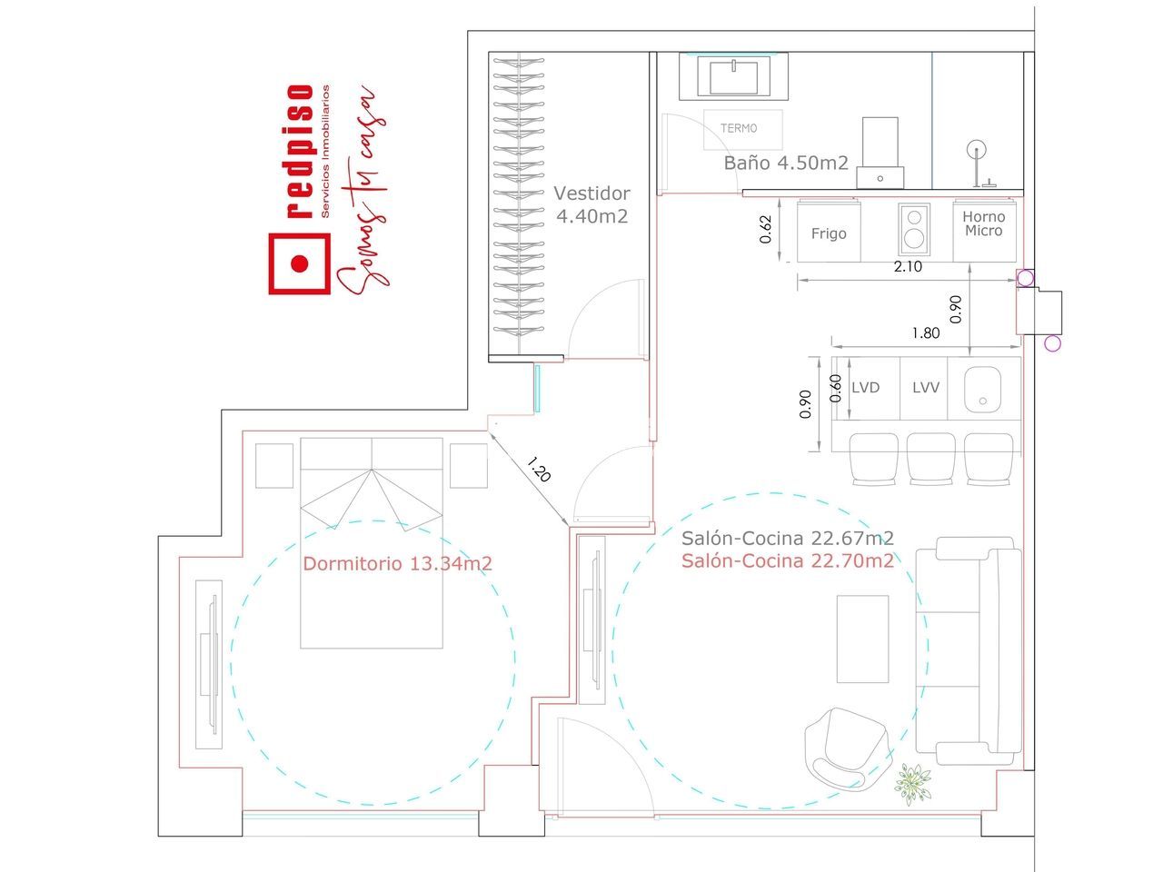 Sus 50 m2 se distribuyen en un dormitorio con vestidor, salón-cocina, baño de 3 piezas, con plato de ducha. La cocina está totalmente equipada (lavadora, frigorífico, horno-microondas).
